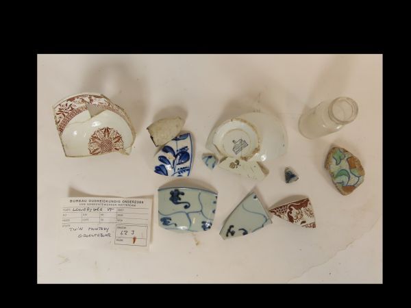 Scherven wit geglazuurd aardewerk, rood en blauw versierd. Een scherf met groene bladversiering. Tevens een glazen flesje en een pijpekop. Inliggend kaartje van B.O.O.R. vermeldt: plaats: Looieryweg VT Situatie: Tuin Monteny, groenteboer. Vondstnr.: LZ 3