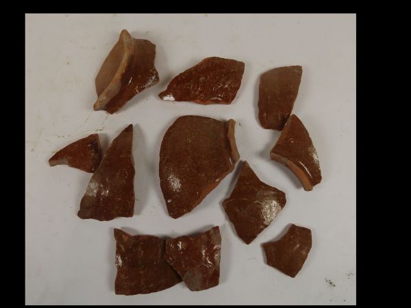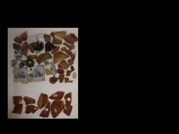 Scherf, divers roodbruin aarderwerk, fragment glazen fles, fragment pot groen geglazuurd, fragenten van borden, blauwbeschilderd op witte achtergrond, eeen fragment bord lichtblauwe achtergrond, onderzijde groen, pijpekop, 2 tegels. Inliggend kaartje van B.O.O.R.: Plaats: Dorpsstraat 61; Datum: mei 1998; Situatie: losse vonsten gedaan bij afbraak en grondverzet voormalig pakhuis Smid; Vondstnr.: DZ8G
