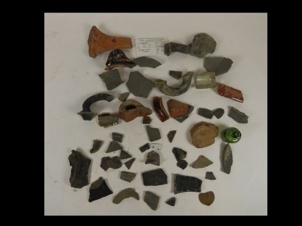 Scherf van diverse potten, roodbruin en grijs aardewerk. Een groen flesje.