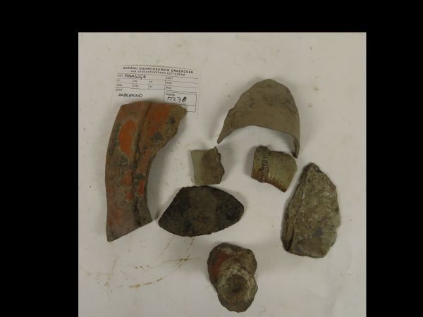 Scherven van potten,5 stuks roodbruin en grijs aardewerk; een stukje leer en een scherf leisteen.