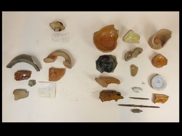 Scherven van diverse objecten, vealal waarschijnlijk kannen. Roodbruin geglazuurd; bodem van eeen schaal of pot, met blauw versierde binnenzijde. Enkele metalen opjecten. Ziel van een glazen pot. Een schedel van (mogelijk) haas, gevonden Maasdijk 17.