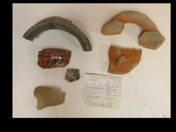 Zes scherven van diverse objecten. Grijs en roodbruin geglazuurd en ongeglazuurd aardewerk.Inliggend kaartje B.O.O.R.: Plaats: Maasdijk. Vondstnr.: MZ 5A Situartie: Zie tekening [ foto's _B en _C; ZWH]