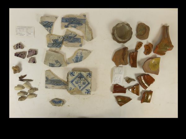 Scherven van twee vondsten, bestaande uit diverse opjecten wit en roodbruin aardewerk, geglazuurd en ongeglazuurd. Wit aardewerk is blauw versierd en bestaat veelal uit - fragmenten van - tegels. Een vijftal pijpekoppen, waarvan een versierd met een kroontje, waarboven: LNH en onder het kroontje een grote hoofdletter N.
