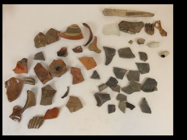 Scherven van verschillende objecten. Roodbruin en grijs aardewerk, geglazuurd en niet geglazuurd. Twee pijpfragmenten, kaakfragment, glasscherf.