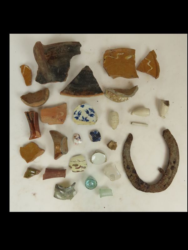 Scherf, diverse objecten, roodbakkend, geglazuurd en ongeglazuurd. Enkele fragment aan rand versierd met gele golven; een fragment is aan binnenzijde versierd met gele scherpen met daar doorheen groene golf. Wit aardewerk, een blauw versierd en een roodbruin versierd fragment. Enkele glazen fragmenten. Losse vondsten Maasdijk.