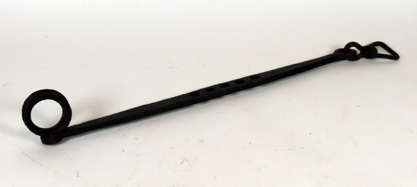 Smeedijzeren staaf met in het midden 5 ronde gaten en aan het ene uiteinde voorzien van een draaibare ring. Aan het andere uiteinde loopt de staaf uit in een oog, waaraan een strop is bevestigd met een trapeziumvormige haak. Het betreft hier een zogeheten hoornjuk of stiergeleider, waarvan de tweede ring ontbreekt. Die moest in ...