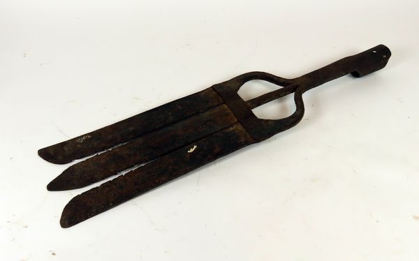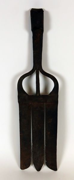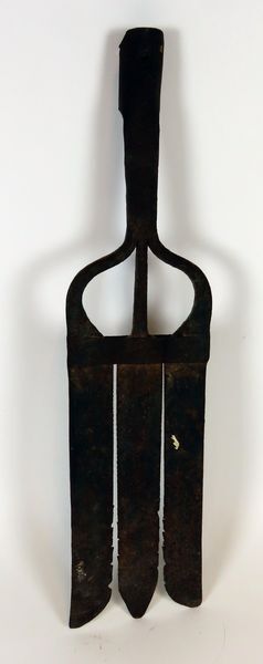 Smeedijzeren vork met drie brede platte tanden voor het vangen paling, ook wel aangeduid als palingsteker, aalgeer, palingijzer of palingvork. De steel ontbreekt.