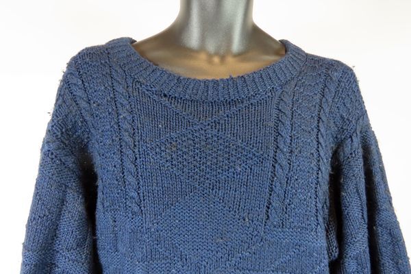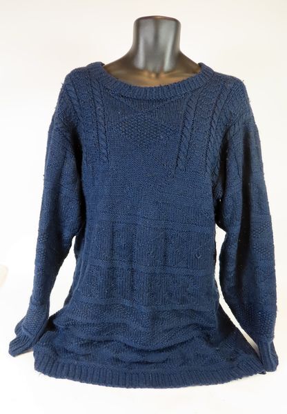 Gebreide donkerblauwe trui. Elk vissersdorp had zijn eigen gebreide trui met uniek patroon. Deze visserstrui heeft het patroon van Zwartewaal.