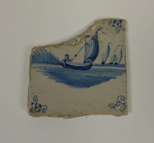 Tegel, blauw beschilderd. Voorstelling van zeilschepen op zee. In de hoeken bijtjes. Hoek linksboven afgebroken.