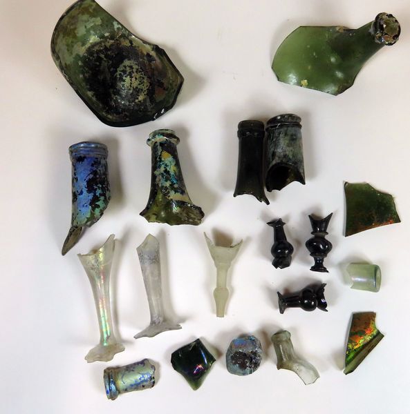 Glasscherven, groen en wit, afkomstig van diverse voorwerpen.