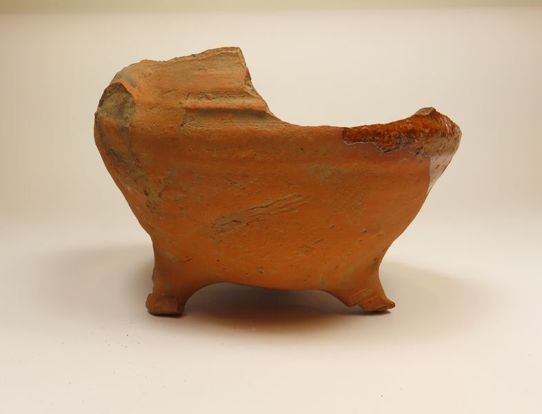 Kookpot van rood aardewerk, staande op 3 pootjes.