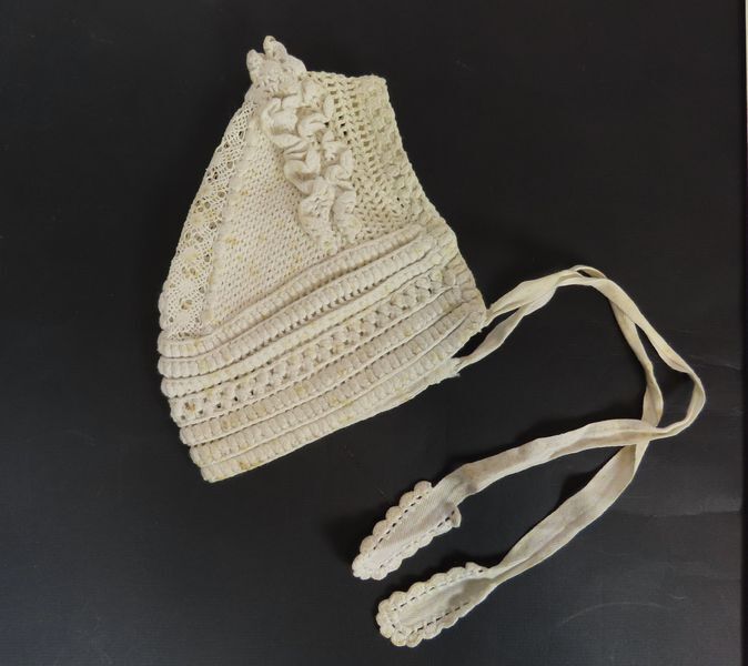 Slaapmutsje,wit-katoen in verschillende patronen gehaakt met twee linten.