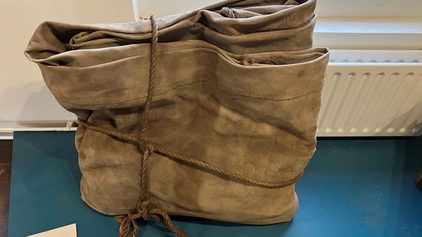 Groot bruin zeil, opgevouwen en met touw vastgemaakt.