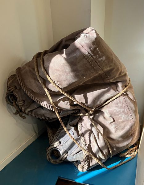 Groot bruin zeil opgevouwen en met touw vastgemaakt.