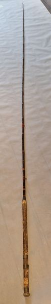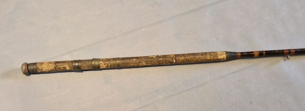 Instrument om vissen te vangen.Aan het handvat zitten bevestigingsringen voor een molen. Het boven stuk heeft 6 ogen om de draad te leiden , het onder stuk 3.