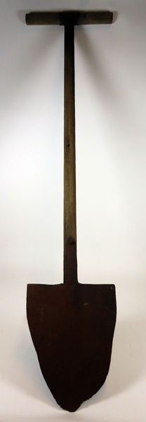 Metalen spade met lange steel voor het afsteken van slootkanten, ook wel aangeduid als lange kantspade. De steel is met een bout en moer in de spade bevestigd. Het handvat is met een metalen band en 23 nagels op de steel bevestigd. Blad loopt uit in een punt.