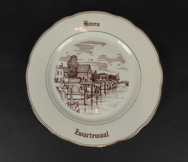 Wit porceleinen bord met gouden rand aan binnen- en buitenzijde van de bordrand. In bordrand boven: haven, onder: Zwartewaal. Binnenin het dorps- en havengezicht Zwartewaal.