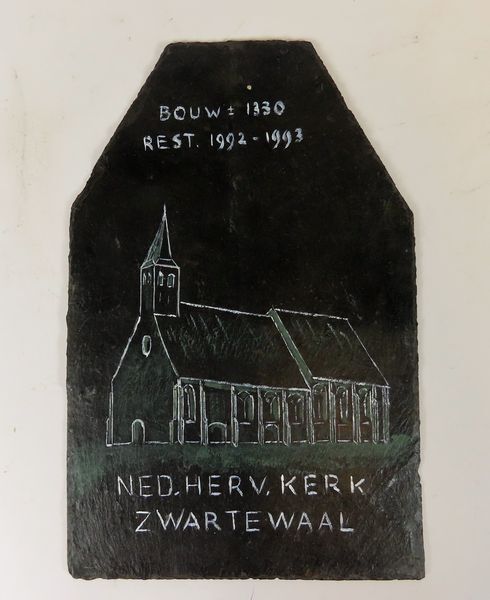 Leisteen ter herinnering aan de reatauratie van de Nederlands Hervormde Kerk te Zwartewaal met in wit afbeelding van de kerk en datering