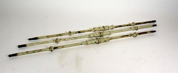 Een drietal wit geverfde metalen spijlen, mogelijk onderdeel van een hek, deur of ledikant. Elke spijl heeft twee ringvormige verdikkingen aan (bijna) de boven- en onderzijde. In het midden is steeds een ringvormige verdikking aangebracht met daarboven en onder een bewerking.