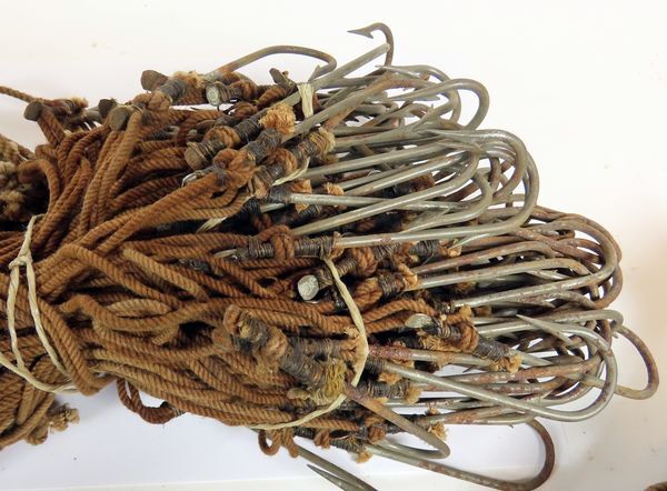 Twee bundels van 100 lijnen met metalen haken gebruikt voor de beugvisserij.