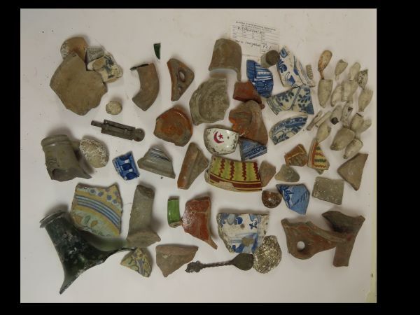 Scherven van divers geglazuurd aardewerk. Fragmenten van kookpotten, schalen, een kopje. Tevens een slotje, een theelepel en enkelele glasscherf.plm 50. Daarnaast 18 fragmenten van pijpen