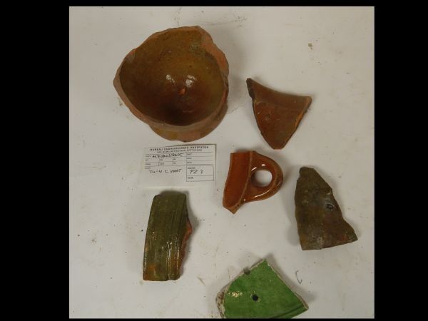 Zes scherven aardewerk. Roodbakkend geglazuurd (3) groen geglazuurd (1) ben en grijs.