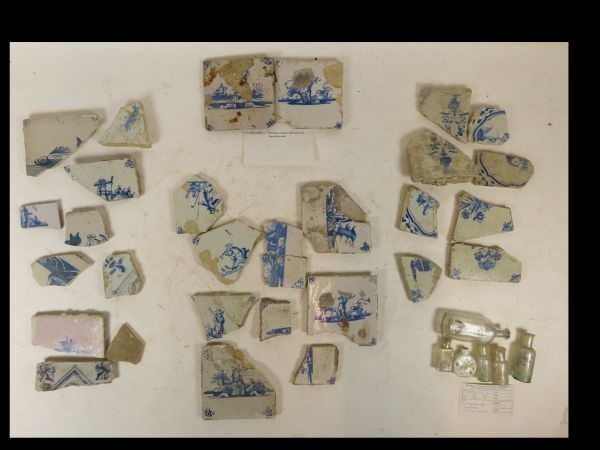 Scherven van delftsblauwe tegels met diverse motieven (29), alsmede een zestal flesjes. Daarvan 3 flesjes met maataanduiding op bodem, 2 met aanduidng inhoud en een porceleinen flesje. Vondst is gedaan tijdens restauratiewerkzaamheden in de keukenkelder van de familie Hilhorst , Noordeinde 20 te Zwartewaal