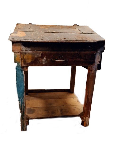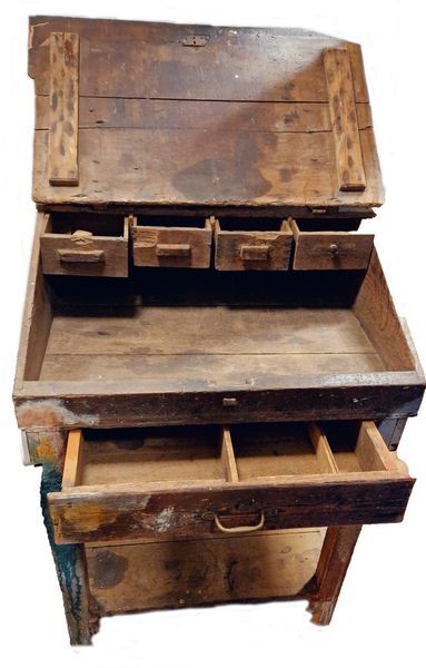 Rechthoekige houten lessenaar met schuin aflopend schrijfvlak dat tevens dient als afsluitbaar deksel van de opbergruimte onder het schrijfvlak. Het deksel is met twee opliggende scharnieren bevestigd. Achterin de opbergruimte bevinden zich vier laatjes, waarvan één met een bakelieten knopje als handvat. De andere laatjes hebben houten handgreepjes.. Onder de opbergruimte bevindt zich een afsluitbare ...
