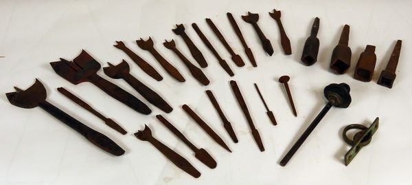 Verzameling bestaat uit 19 houtboren, 4 dopsleutels, 1 nagel met platte kop, 1 deursluiting en 1 onbekend voorwerp.