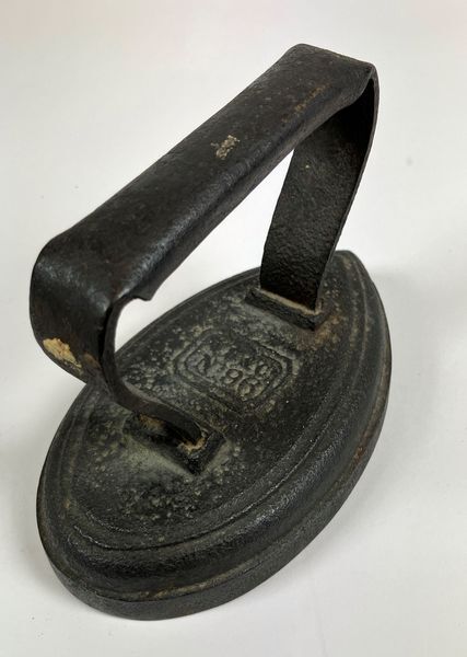 Strijkijzer, merk "W. B. & C. ", met smeedijzeren handvat, zogenaamde kachelbout.
