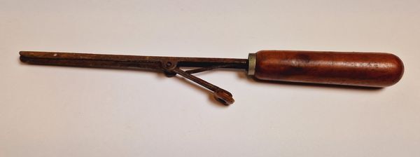 Deze krultang met houten handvat en veer mechanisme, moet vóór gebruik op een kachel of in de buurt van een warmtebron zijn verwarmd. Hij werd gebruikt om krullen in het haar aan te brengen. Gezien de grootte van de tang zou het ook mogelijk zijn dat dit een speciale snor krultang is.
