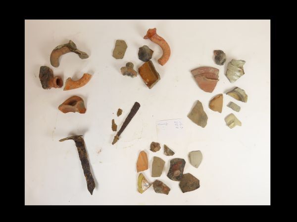 Scherven (plm 30 ex.n) meerendeels van potten, een tweetal ijzeren voorwerpen.