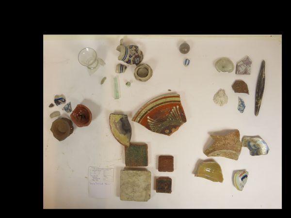 Scherven van aardewerk en glas (plm. 30). Potscherven, div. geglazuurd, wit blauwe schaaltjes en meerkleurig, schaalscherven geglazuurd. Een viertal tegels : 12.5/12.59/9, en 6/6 cm. Een kannetje, grijs aardewerk (deels gelijmd) met blauw-bruine versiering; schenkopening 5 cm. Vondstnr. SZ 1 Schoolstraat, Zwartewaal bij aanleg riolering jan. 1984.