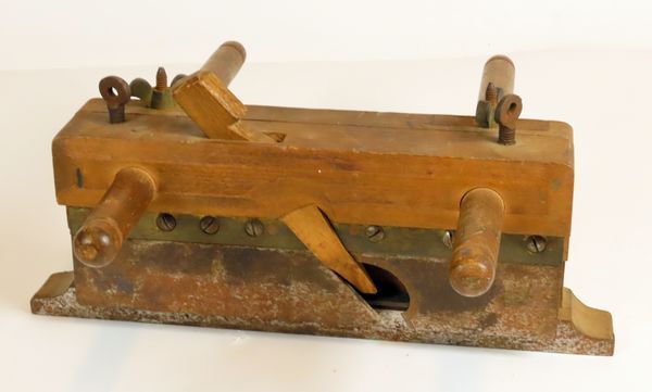 Houten ploegschaaf, ook wel aangeduid als groef-, profiel- of sponningschaaf, met twee ronde stokken/handvatten. Het instellen van de diepte gebeurt met twee gesmede schroeven met een platte ronde kop. Met behulp van twee messing vleugelmoeren kan de breedte van de groef of sponning worden ingesteld. De smalle metalen beitel ontbreekt, maar de houten wig waarmee ...