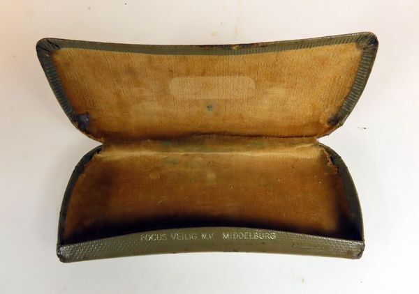 Koker, zijnde een brillenkokervan nammakleer. Binnenzijde bekleed met een lichtbruine stof.