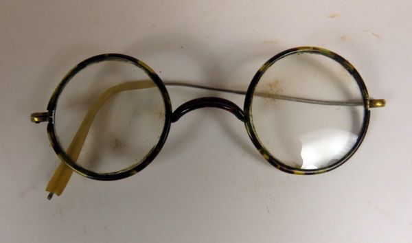 Bril, bruin-beige gemêleerde glasranden en neusbrug. Metalen arm met plastic oorbescherming.