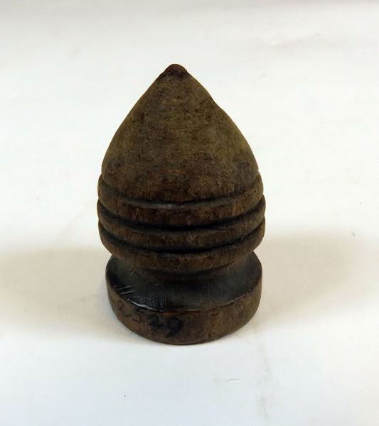 Tol, zijnde een priktol. Onbeschilderde houten tol, peervormig met 3 smalle inkervingen rondom onder het midden. Daaronder een diepere en brede inkerving. Metalen punt.
