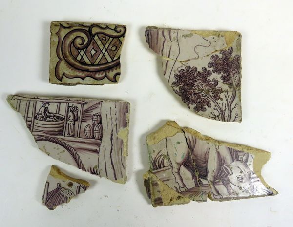 Vijf scherven van geglazuurde wandtegels, beschilderd met motieven van boerenwerk, een varken en een hooiberg.