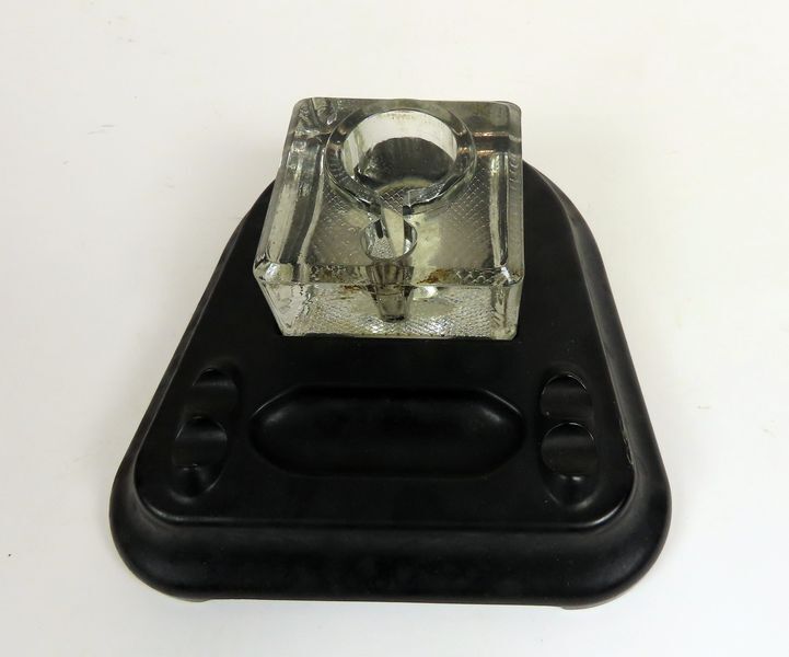 Inktstel, zijnde een plateau van zwart plastic met mogelijkheid pen op te leggen, en een glazen inktpot, voorzien van een groot rond gat, in open verbinding met klein rond gat. Onderzijde heeft een klein raster.