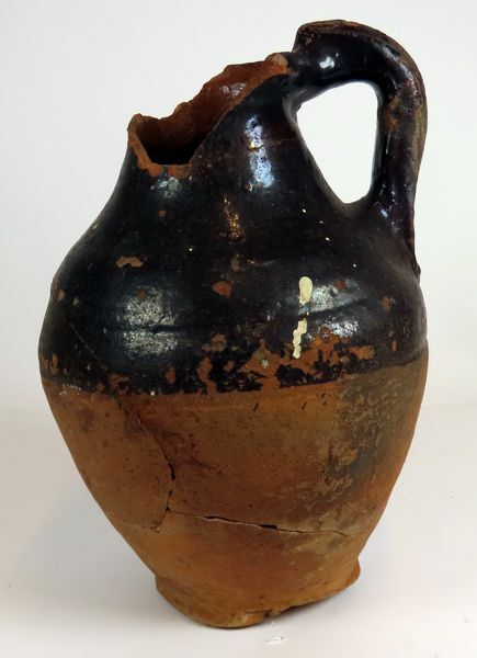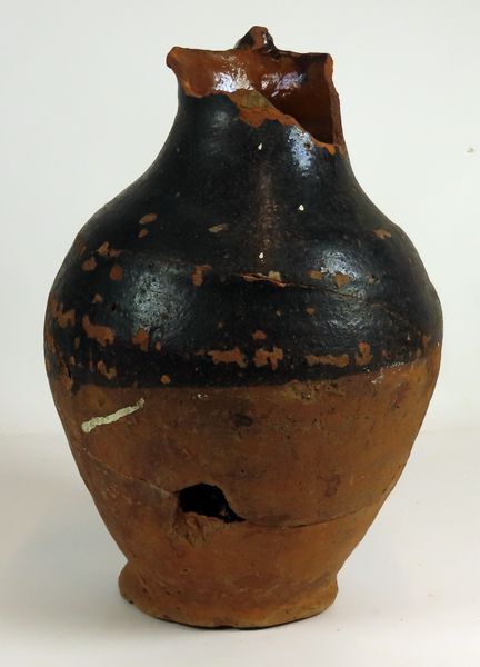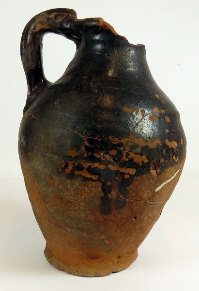 Roodbakkende aardewerken kruik met bandoor. Gedeeltelijk donkerrood geglazuurd.