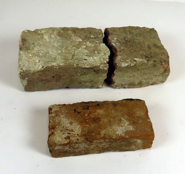 Grote licht rode baksteen, in twee stukken gebroken, en een kleine rode baksteen.
