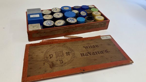 Sigarenkistje van hout met los deksel; gebruikt om educatieve filmstrips voor de projector in op te bergen.De filmstrips zijn apart geregistreerd onder nummer Z02573 t/m Z2595.