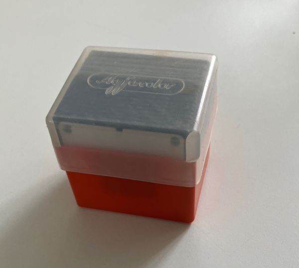 Rood plastic doosje met doorzichtig deksel bevattende 17 dia's met foto's van spelende schoolkinderen.