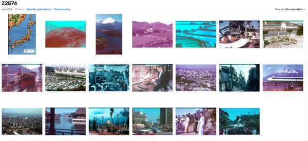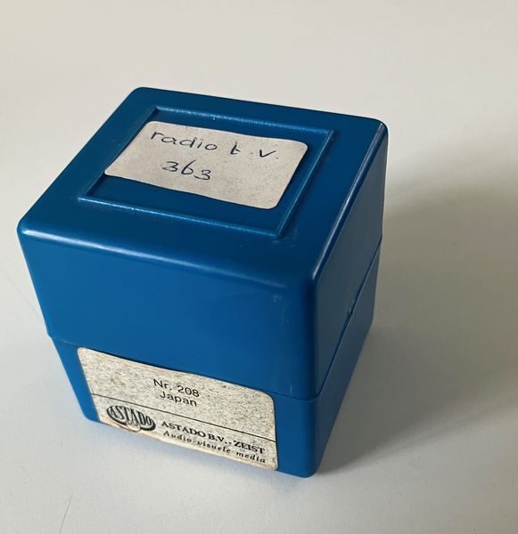 Blauw plastic doosje met 20 dia's over Japan, gebruikt in het onderwijs, met projector Z2564.