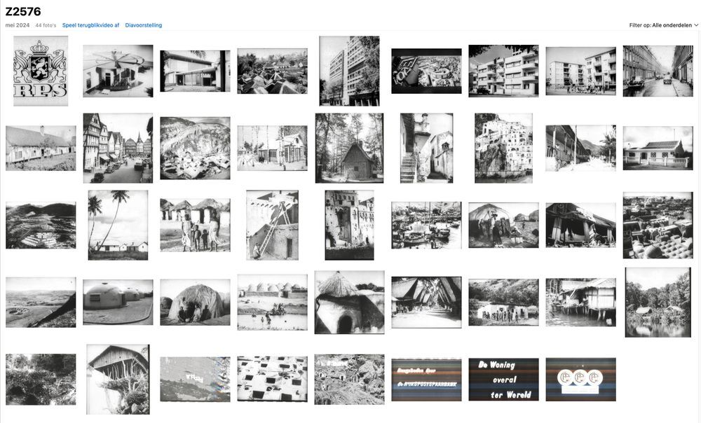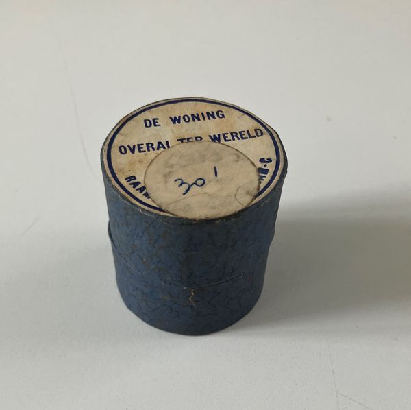 Filmstrook, 35mm met 40 afbeeldingen over " DE WONING OVERAL IN DE WERELD" ,in kartonnen koker met deksel.Gebruikt in het onderwijs, met projector Z2564.