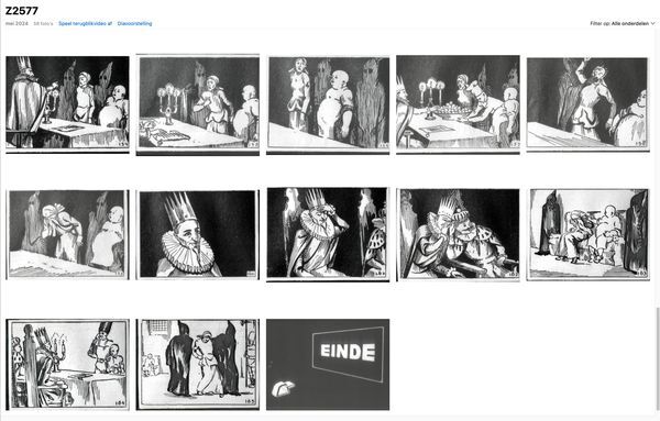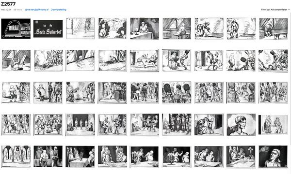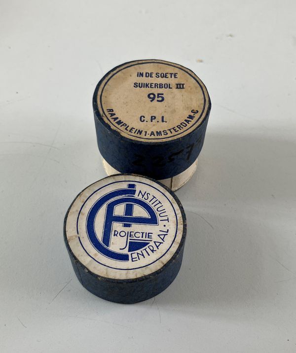 Filmstrook, 35mm met 50 afbeeldingen"In de soete suikerbol III" ,in kartonnen koker met deksel.Gebruikt in het onderwijs, met projector Z2564.