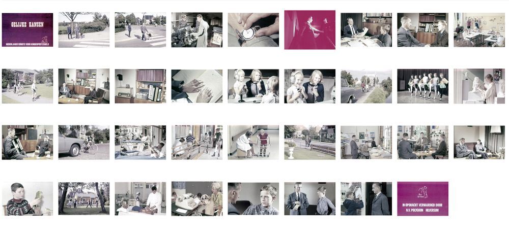Filmstrook, 35mm met 35 afbeeldingen over "gelijke kansen" ,in plastic koker met deksel.Gebruikt in het onderwijs, met projector Z2564.
