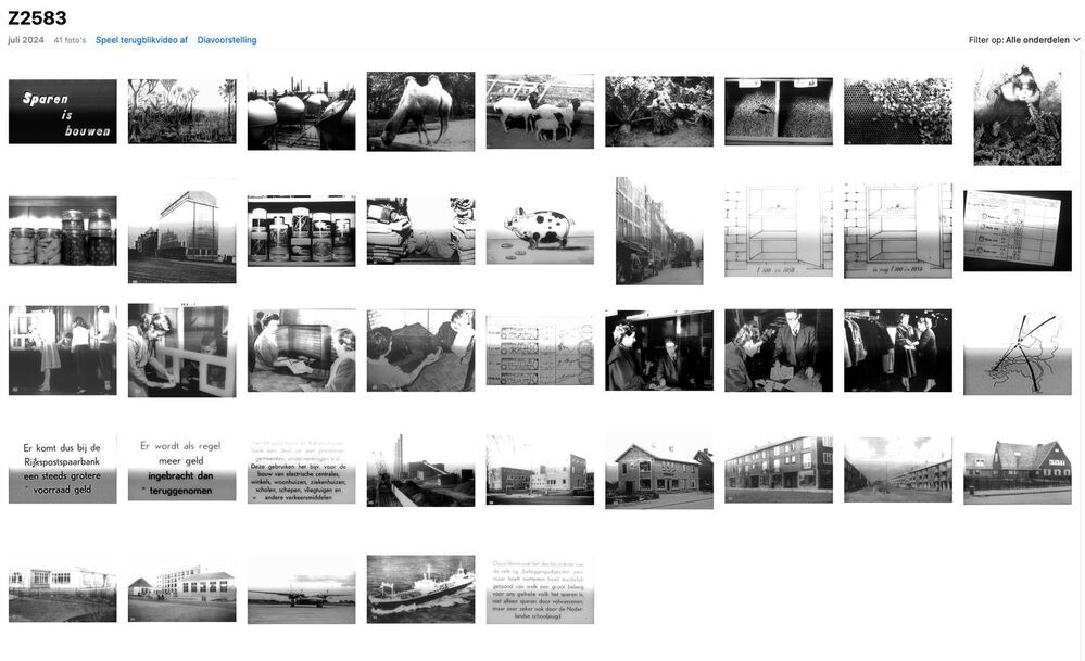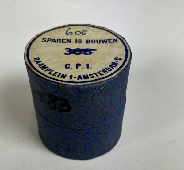 Filmstrook, 35mm met 40 afbeeldingen over "sparen is bouwen " ,in kartonnen koker met deksel.Gebruikt in het onderwijs, met projector Z2564.