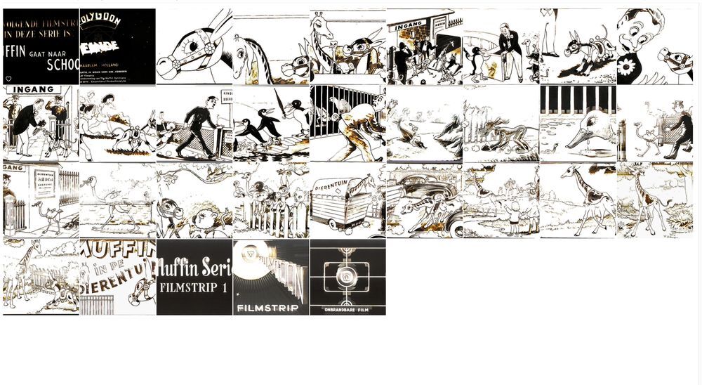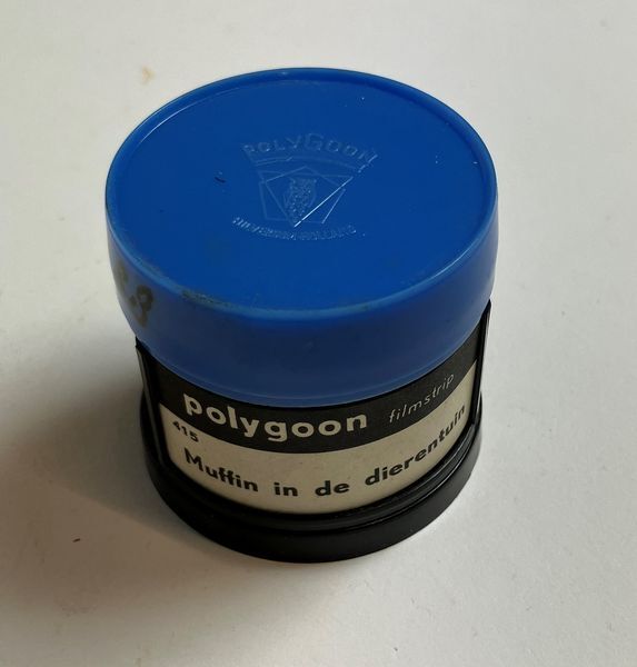 Filmstrook, 35mm met 26 zwart-wit afbeeldingen over " Muffin in de dierentuin", in zwart plastic koker met blauw deksel.Gebruikt in het onderwijs, met projector Z2564.