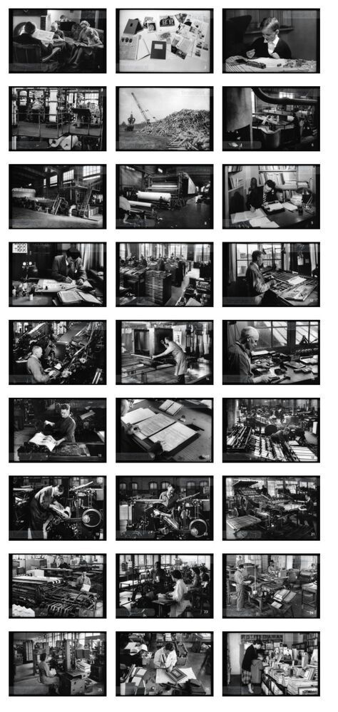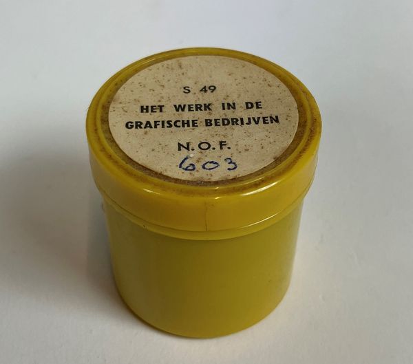 Filmstrook, 35mm met 27 afbeeldingen over " het werk in de grafische bedrijven", in geel-plastic koker met deksel.Gebruikt in het onderwijs, met projector Z2565.